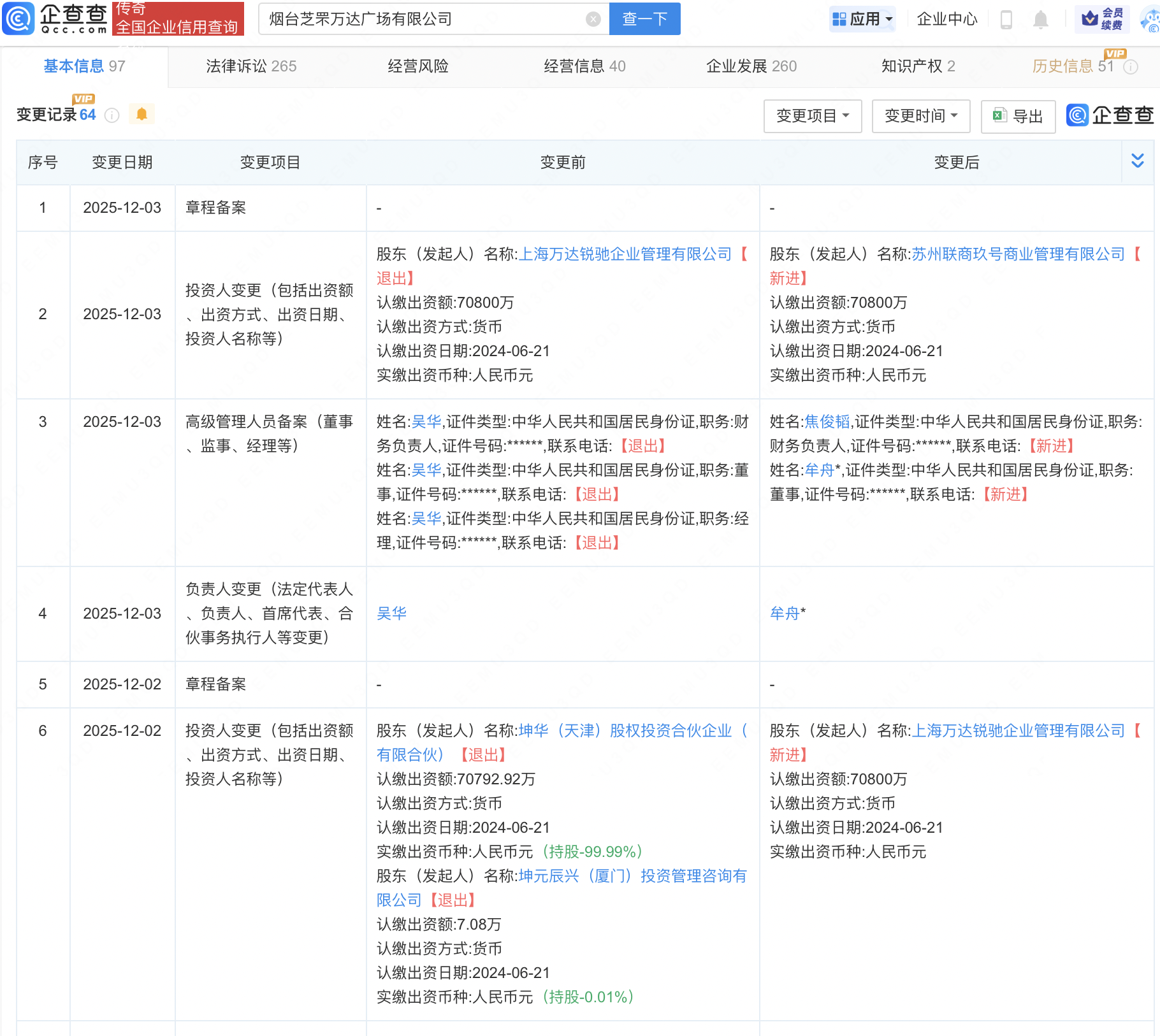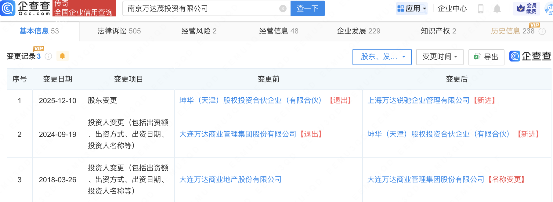 近日,南京万达茂投资有限公司发生工商变更,原股东坤华(天津)股权投资合伙企业(有限合伙)退出,新增上海万达锐驰企业管理有限公司为全资股东,同时主要成员发生变更。企查查信息显示,该公司成立于2014年,注册资本14.42亿元。2024年9月,大连万达商业管理集团股份有限公司退出该公司股东,由坤华(天津)股权投资合伙企业(有限合伙)接盘全部股权。此前12月2日,烟台芝罘万达广场有限公司发生工商变更,新增上海万达锐驰企业管理有限公司为全资股东,然而,12月3日,上海万达锐驰企业管理有限公司退出股东行列,苏州联商玖号商业管理有限公司变为全资持股,法定代表人及主要人员也有变动。这意味着,万达集团首次赎回的一座万达广场,仅一天就被转让。